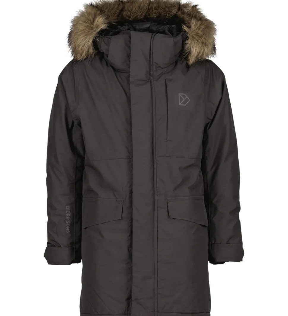 Didriksons vinterfrakken er en lang model, som går ned over lårene. Den har en aftagelig hætte, som er fæstnet med trykknapper og velcro langs den høje krave. Hætten har en flot, imiteret pelskant, der kan tages af ved hjælp af skjulte trykknapper. I toppen kan hætten justeres med velcrorem.