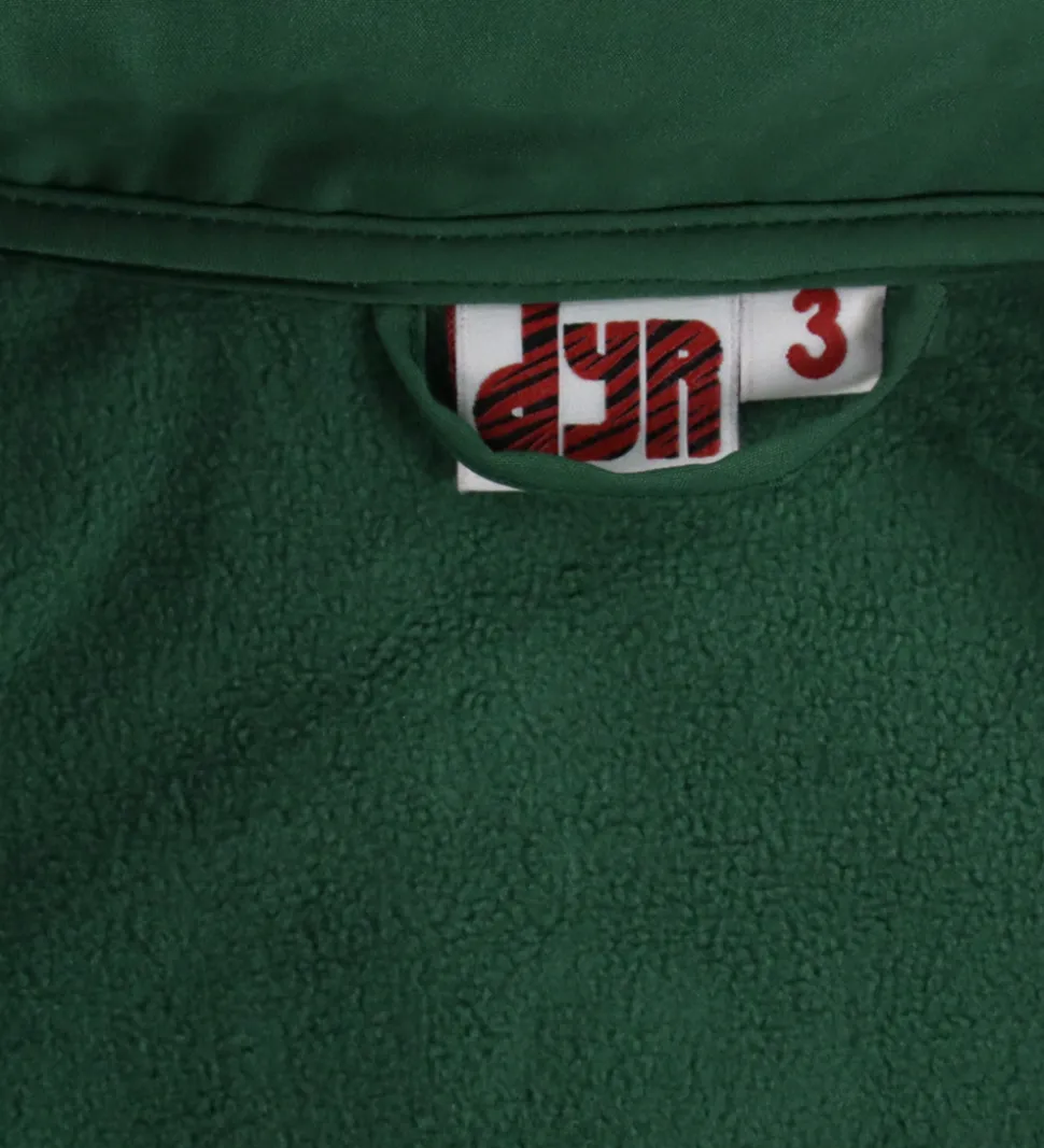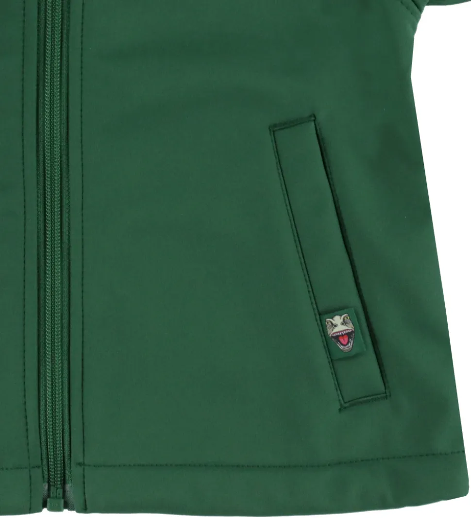 Fin DYR-Cph softshelljakke i grøn med et stort print af en t-rex på ryggen.