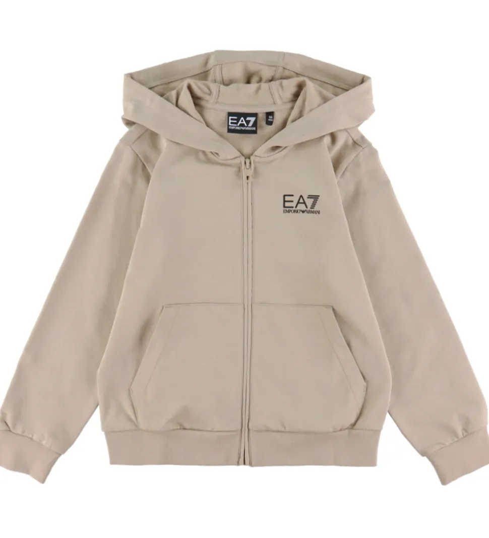 Lækker EA7 cardigan i beigefarvet sweat, og fortil i venstre side er der trykt et lille, sort logo.