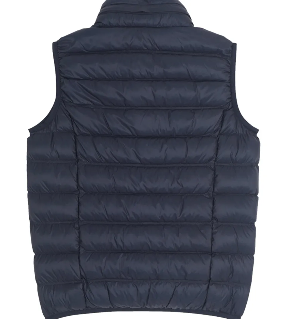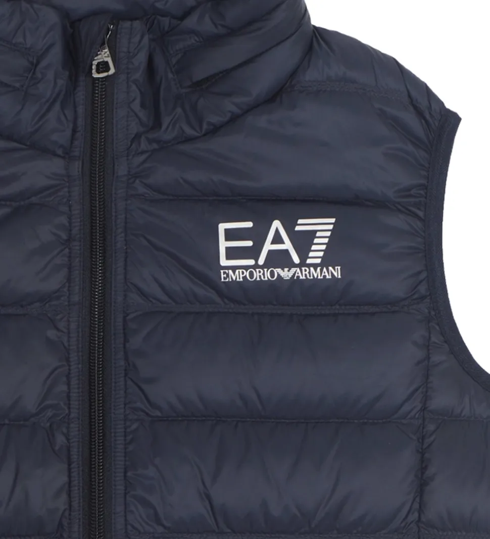 Lækker EA7 dunvest i ensfarvet navy i en glatvævet kvalitet, og fortil i venstre side er der trykt et sølvfarvet logo.