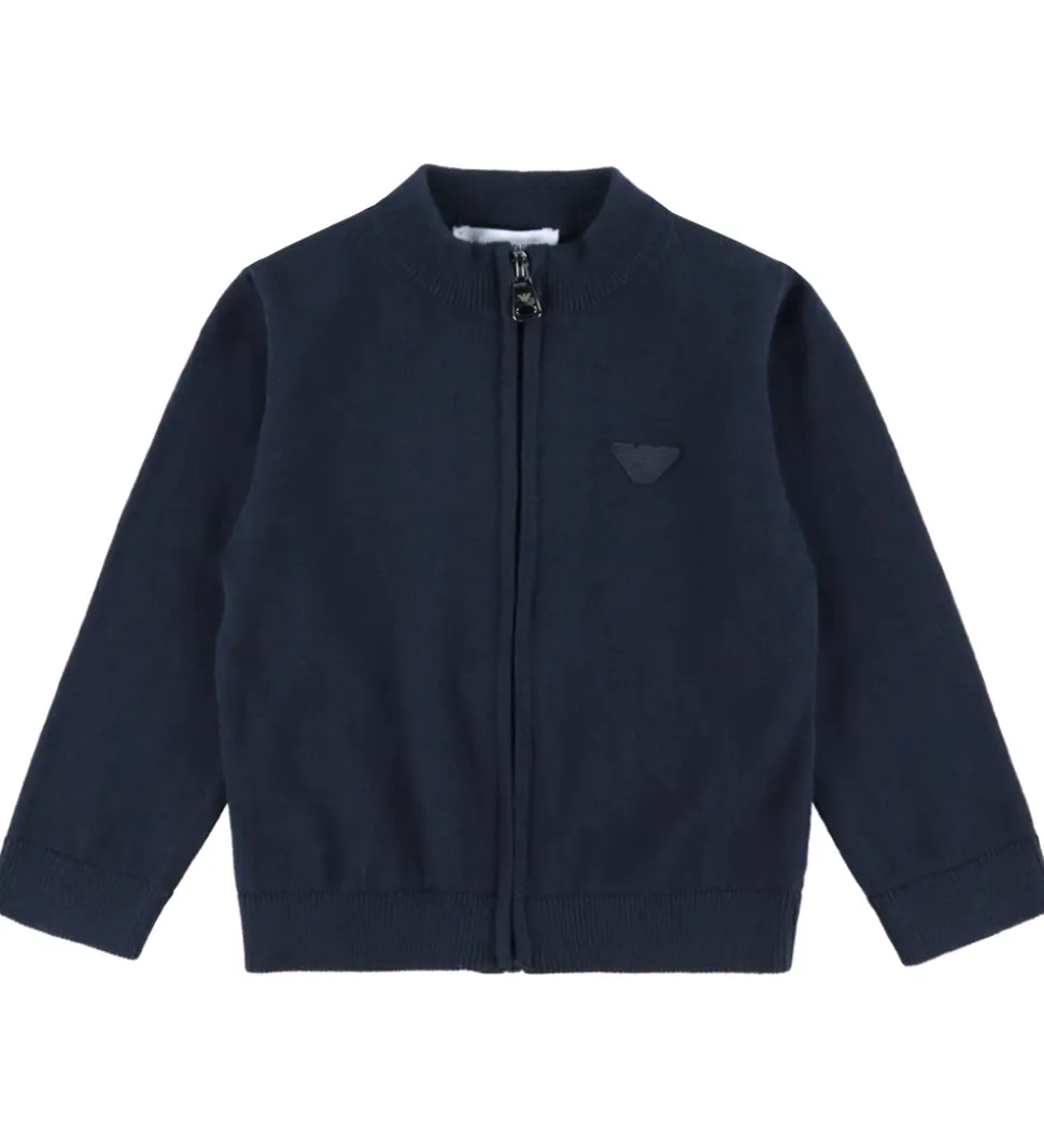 Stilfuld cardigan fra Emporio Armani i en dyb navyblå nuance. Cardiganen er lavet i en blød, strikket kvalitet i en blanding af uld og bomuld. Ribdetaljer ved halsen, ærmerne og nederst på cardiganen giver et klassisk look. En diskret Emporio Armani logo-applikation pryder brystet. Foran er der en praktisk lynlåslukning.