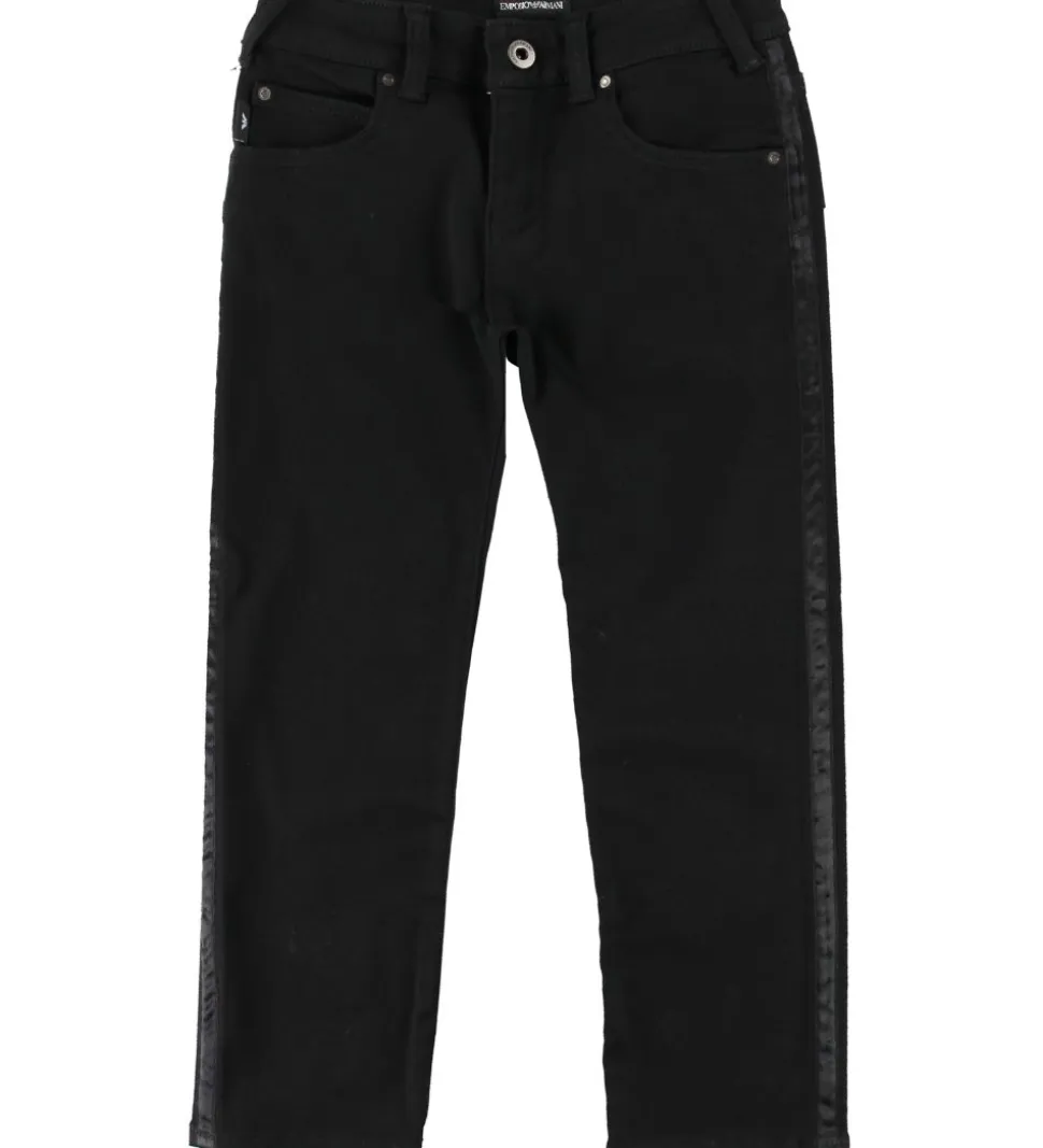 Lækre Emporio Armani jeans i ensfarvet sort og i en strækbar kvalitet. I siderne er der ned langs buksebenene en smal sort kant i glatvævet kvalitet.