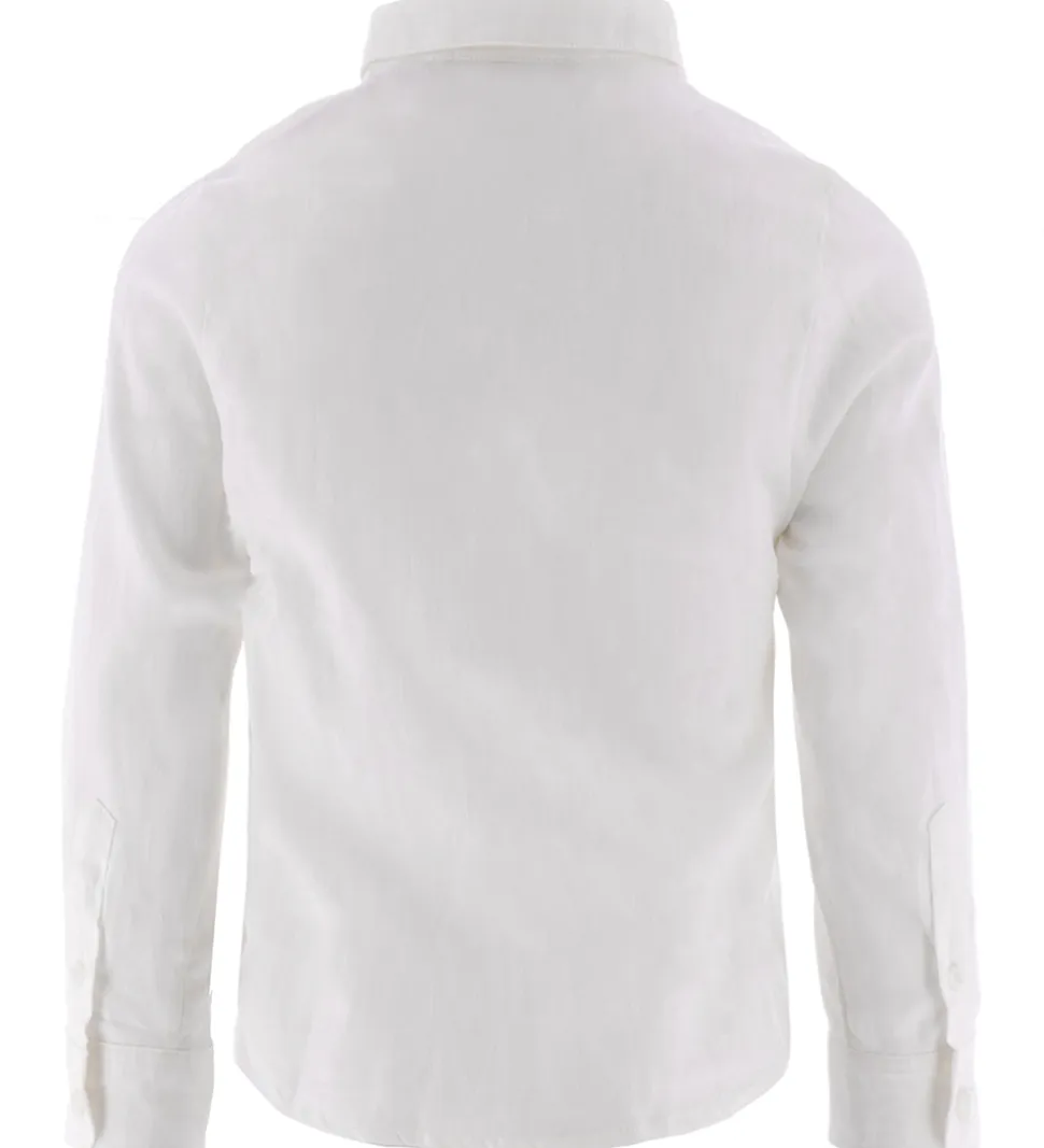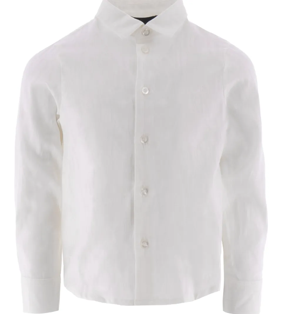 Fin Emporio Armani skjorte i ensfarvet hvid med et diskret allover mønster med navnet “Emporio Armani”.