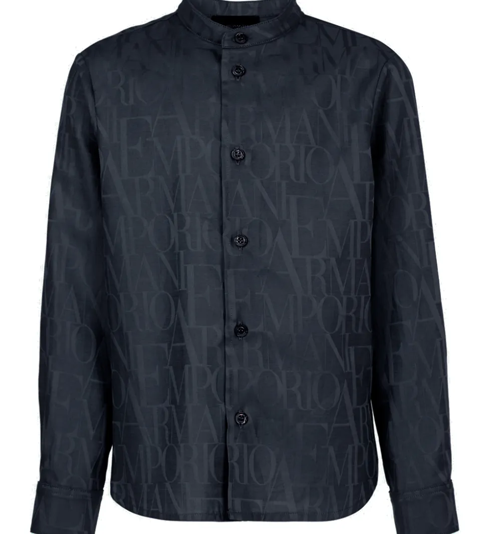 Smart Emporio Armani skjorte i ensfarvet navy med et diskret allover mønster med navnet “Emporio Armani”.