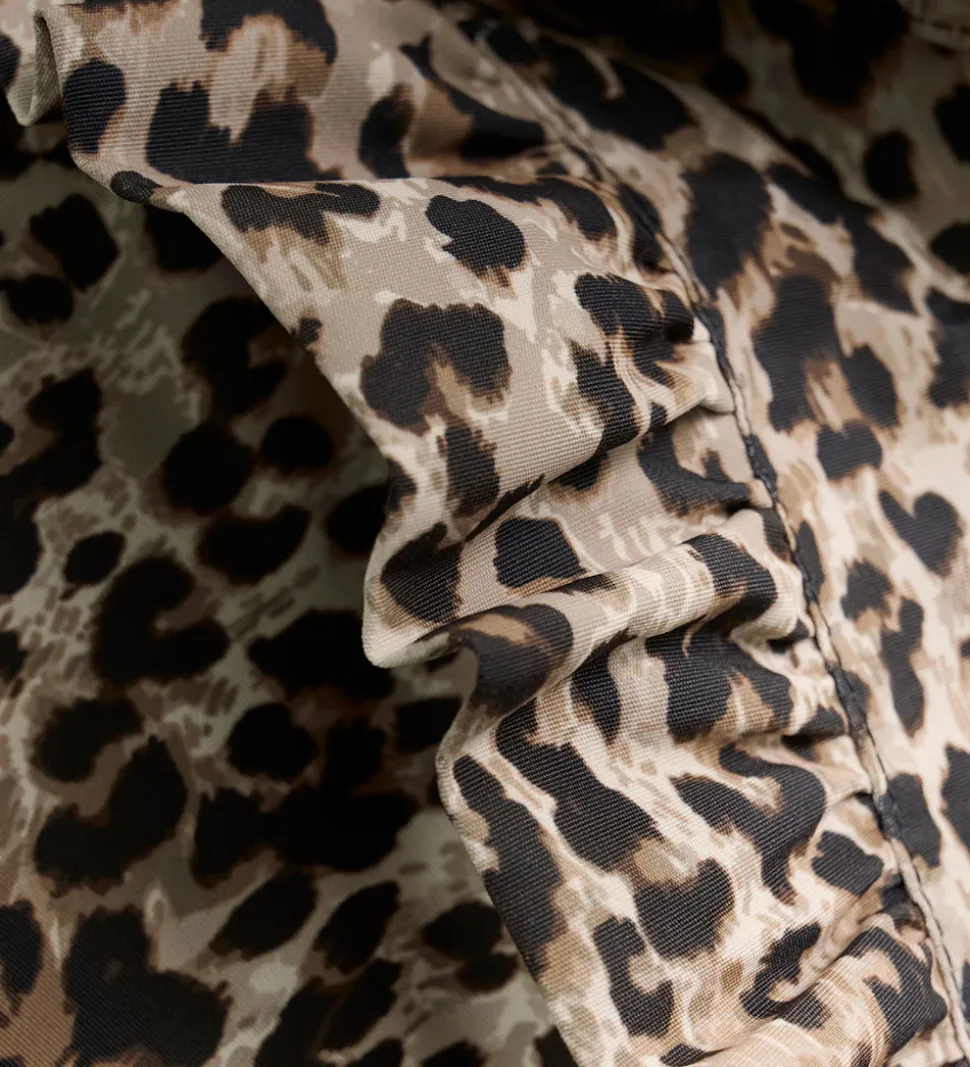 Pæn En Fant flyverdragt med et leopardmønster i sort og beige. Flyverdragten er med refleksprint og -pipings og har flotte flæser over skuldrene.
