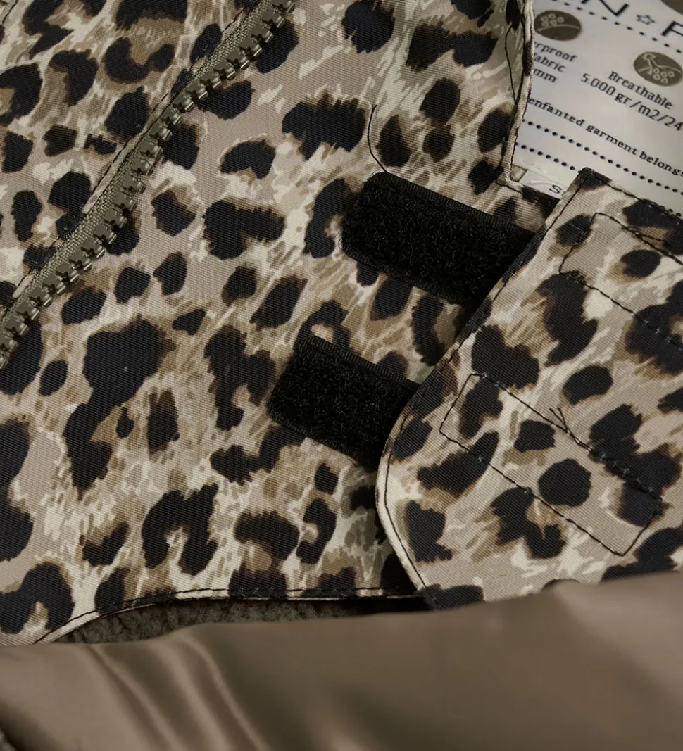 Dejlig En Fant flyverdragt med leopardprint i sort og beige. Flyverdragten er med refleksprint og -pipings og har flotte flæser over skuldrene.