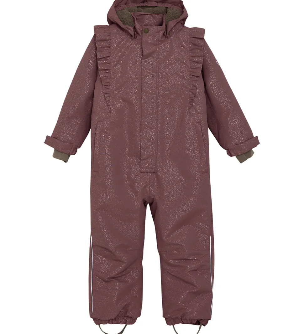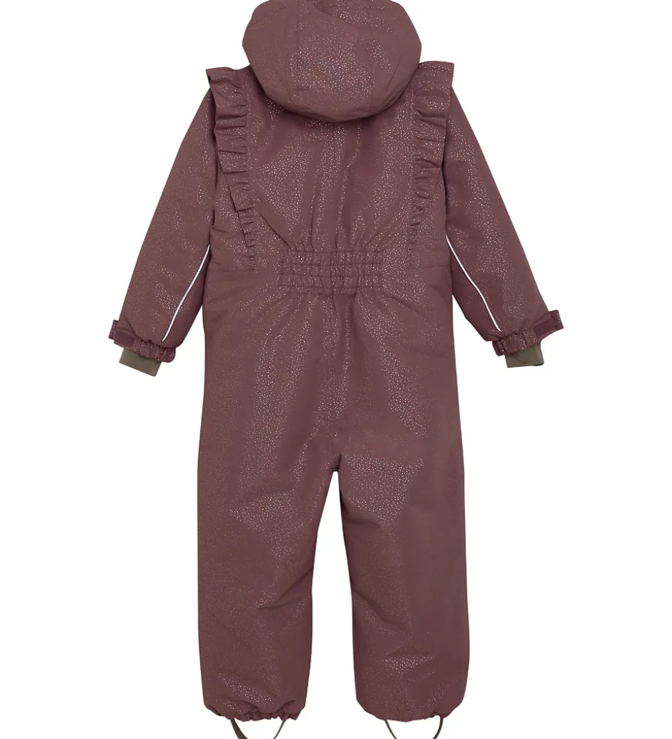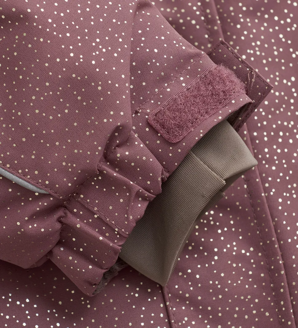 Pæn En Fant flyverdragt i mørk rosa med et allovermønster af skinnende guldprikker. Flyverdragten er med refleksprint og -pipings og har flotte flæser over skuldrene.