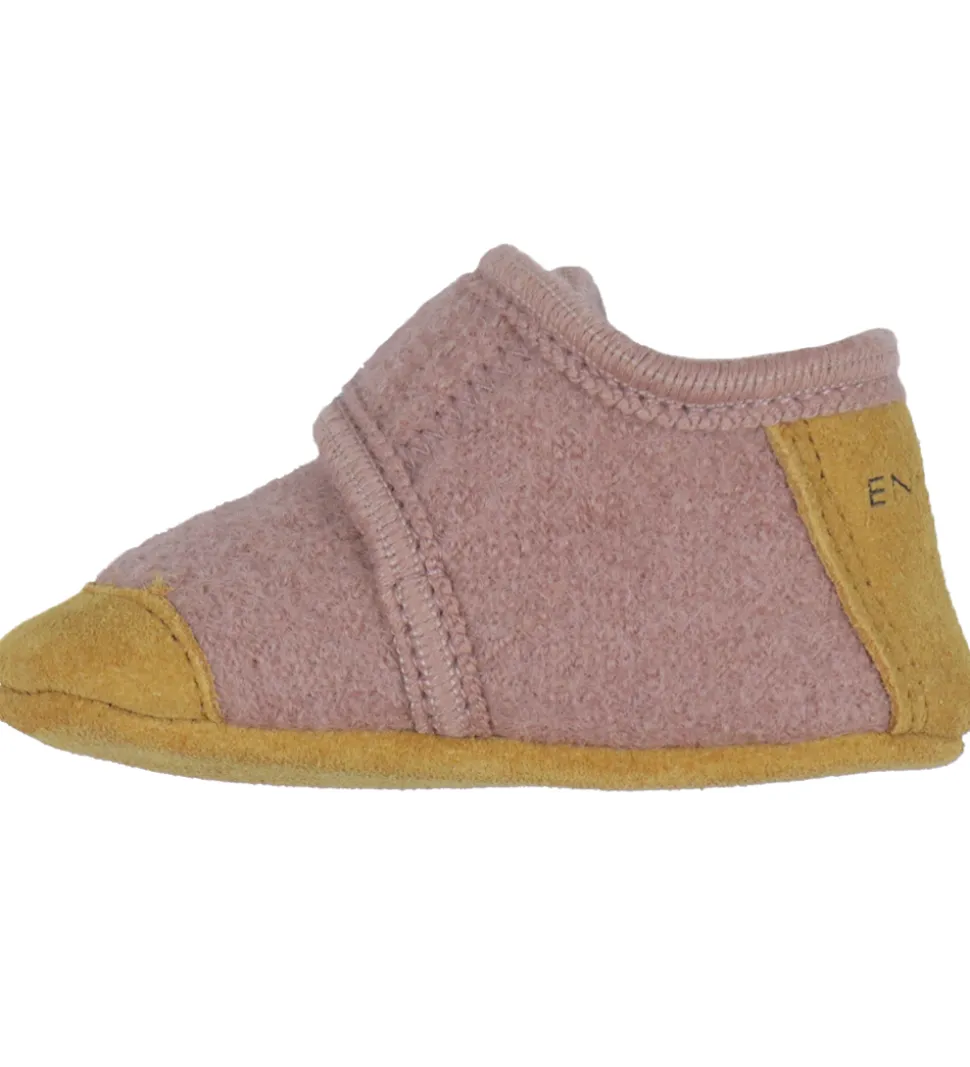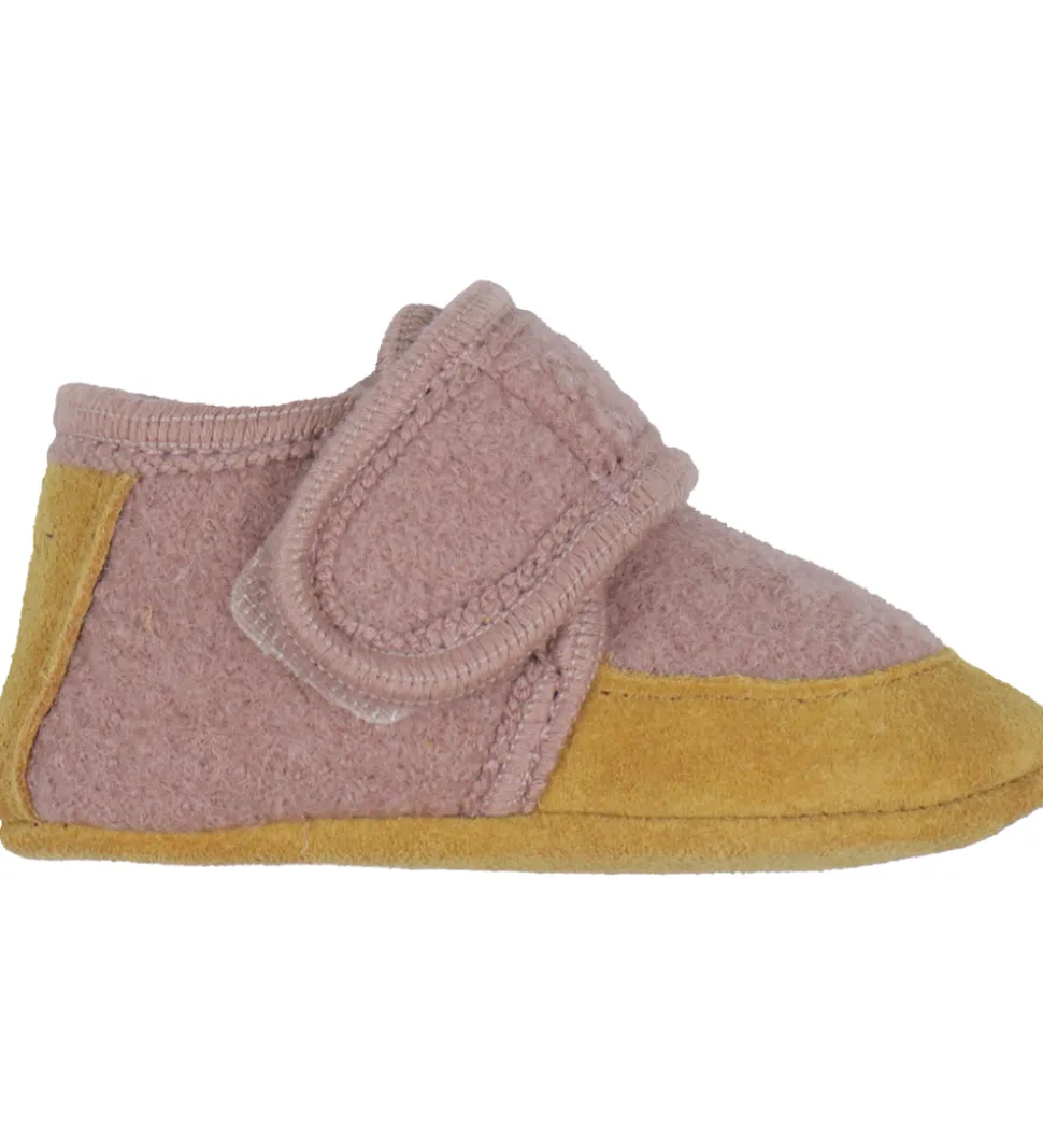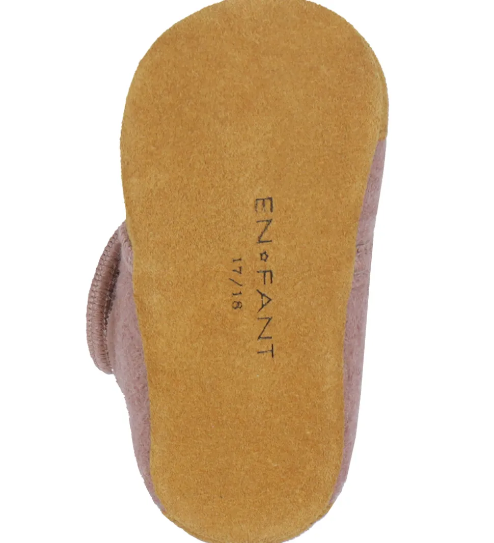 Søde En Fant hjemmesko i rosa uld med lysebrunt ruskind på snuden og hælen.
