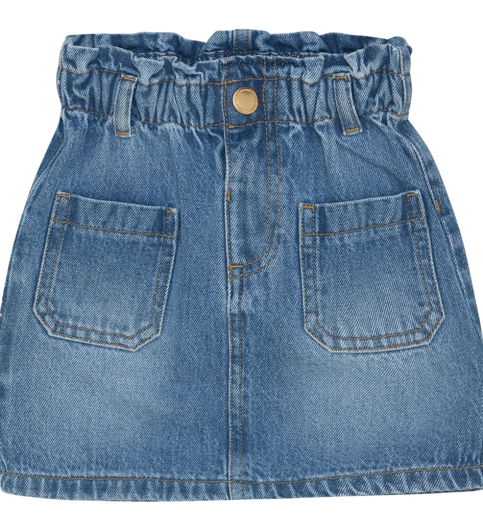 Flot En Fant nederdel i blå denim med to forlommer. En Fant nederdelen er en kort model med en elastisk talje, som kan justeres med knapper indvendigt. Den lukkes fortil med en trykknap og har praktiske bæltestropper.