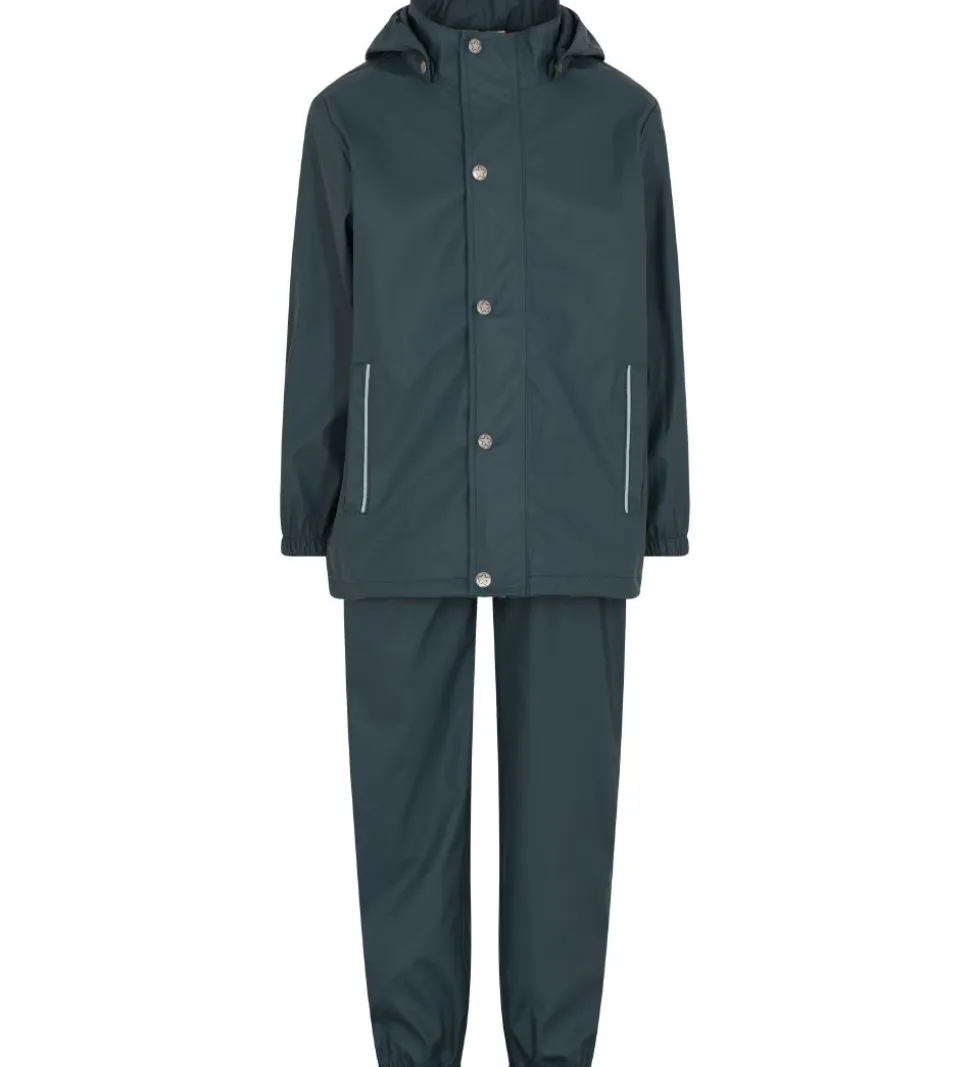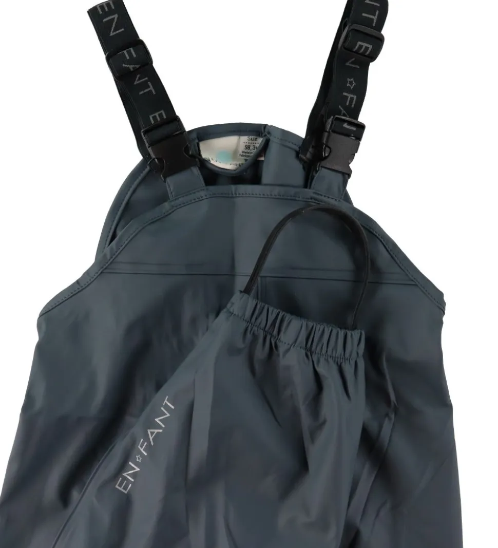 Lækkert En Fant regntøj i PU i støvet blå med sølvfarvede knapper. Regnsættet består af en regnjakke og et par regnbukser med seler.