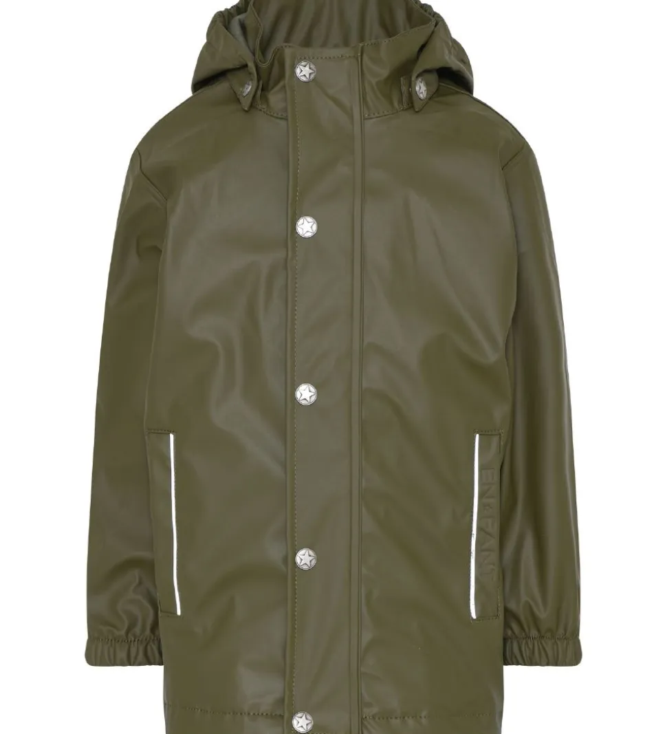 Lækkert En Fant regntøj i PU i armygrøn med sølvfarvede knapper. Regnsættet består af en regnjakke og et par regnbukser med seler.