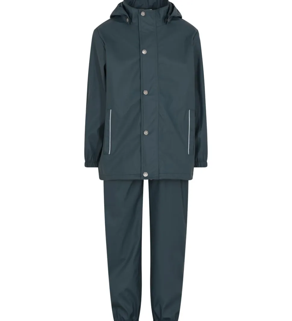 Lækkert En Fant regntøj i PU i støvet blå med sølvfarvede knapper. Regnsættet består af en regnjakke og et par regnbukser.