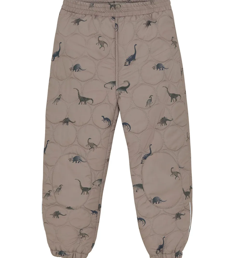 Fint En Fant termotøj i støvet brun med alloverdinoprint og med en indpræget, quiltet struktur i runde cirkler. Sættet består af en termojakke og et par termobukser.