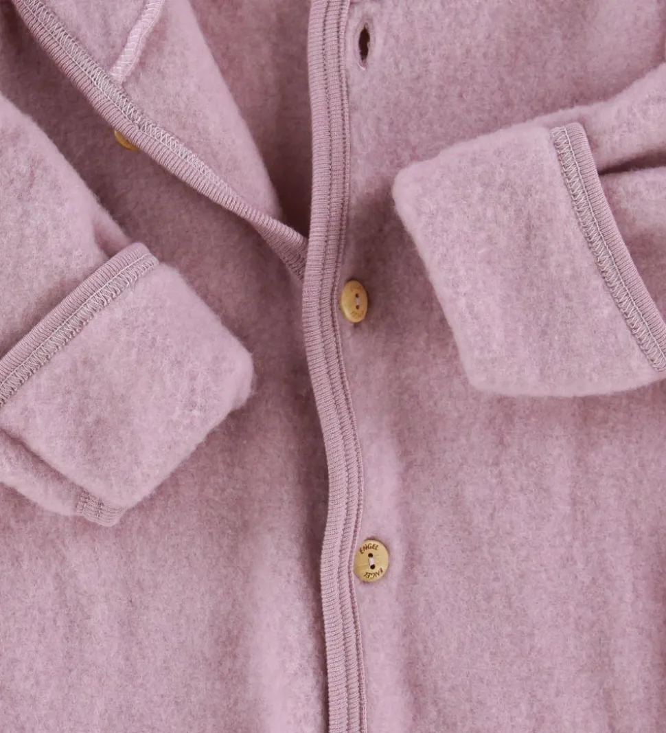 Engel køredragten har en fast hætte og en gennemgående knappeåbning med fine træknapper. Den har lange ærmer og ben, der er kantet med en blød ribkant. Dragten har praktiske ombuk ved hænder og fødder.