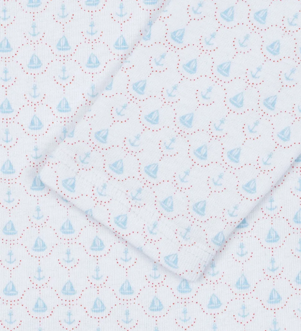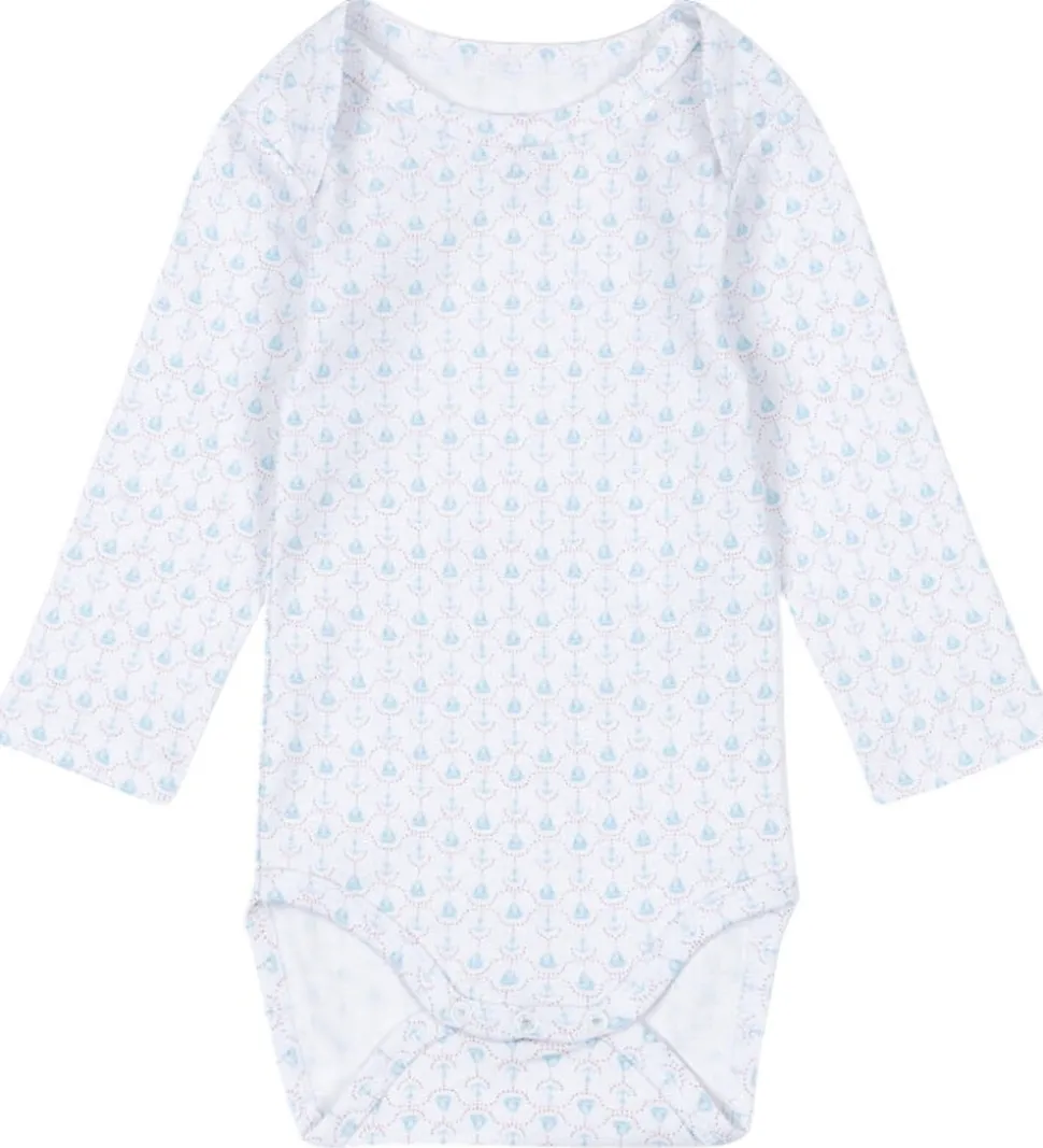 Fin Fanga Fontana body i hvid med lange ærmer og et delikat mønster af små, lyseblå skibe og røde prikker.