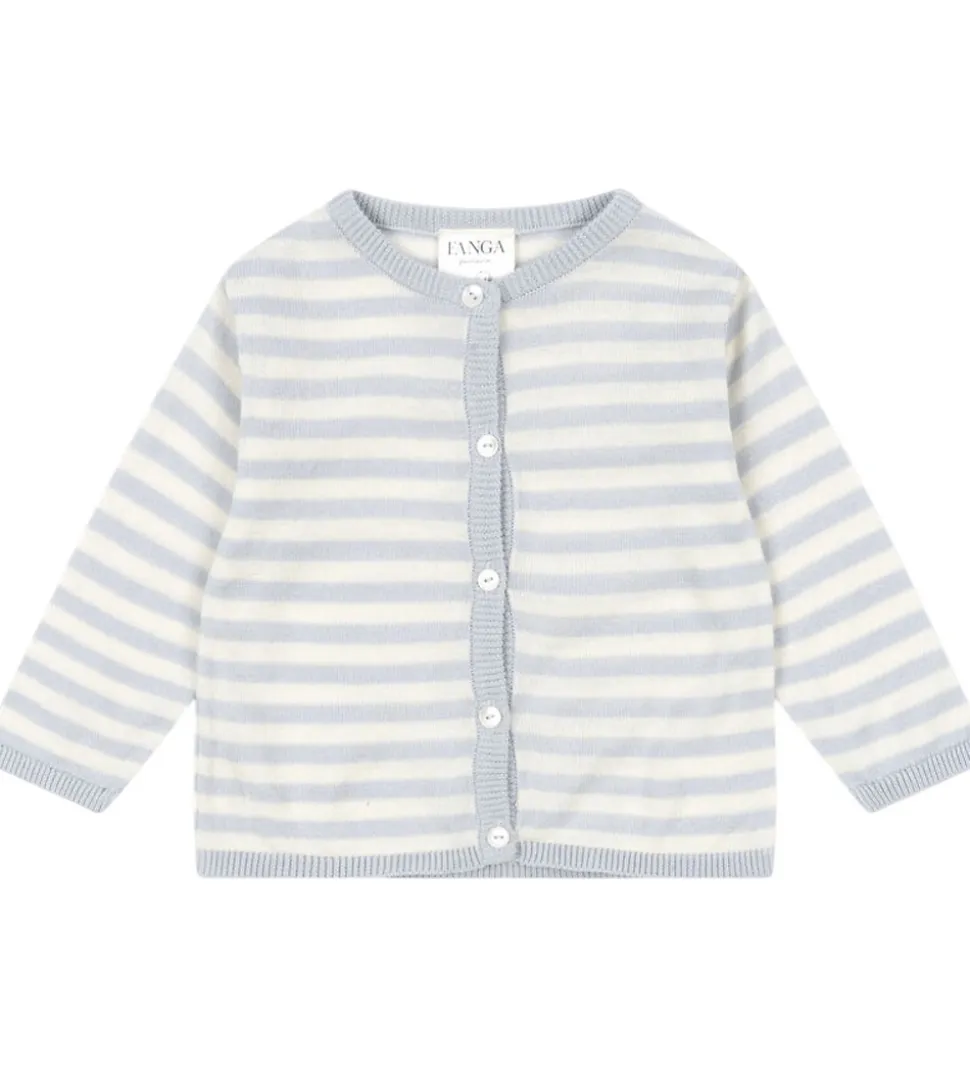Vidunderlig cardigan fra Fanga Fontana strikket i et klassisk stribemønster i bløde nuancer af lyseblå og cremehvid.