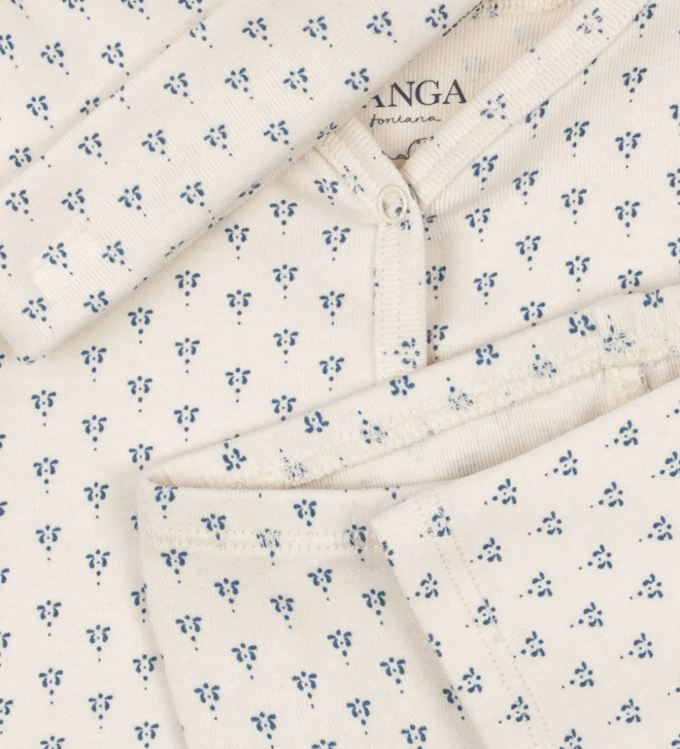Fint Fanga Fontana sæt med en cardigan, et par leggings og en hue. Sætter er i cremehvid med et diskret print af små, blå motiver.