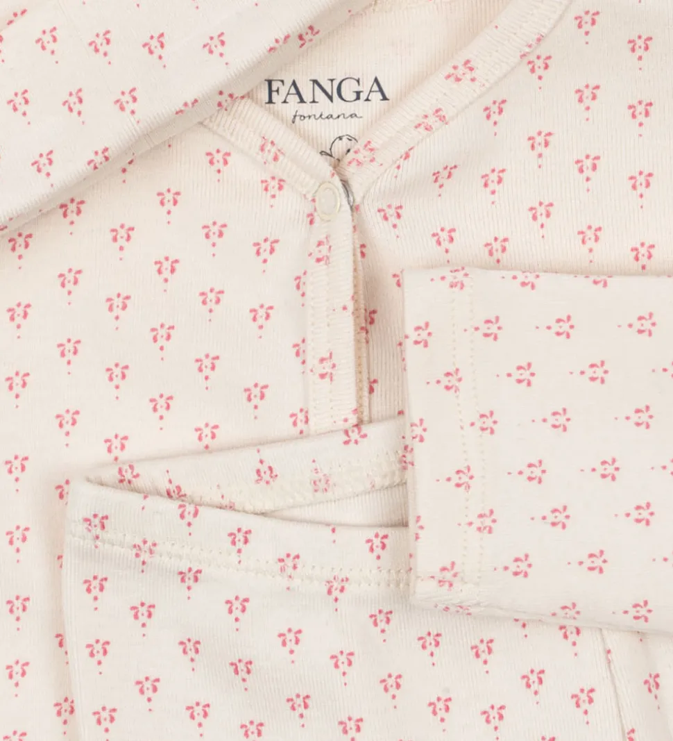 Dejligt Fanga Fontana sæt med en cardigan, et par leggings og en hue. Sætter er i cremehvid med et diskret print af små, rosa motiver.