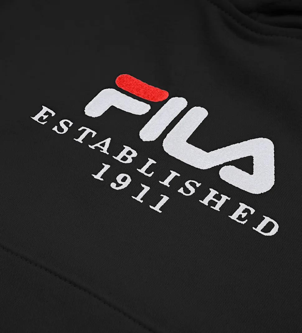 Smart Fila hættetrøje i klassisk sort. Fila hættetrøjen har et logoprint broderet på fronten i hvidt og rødt med teksten “Established 1911”.