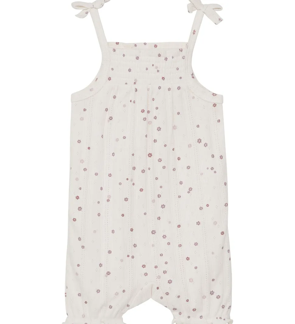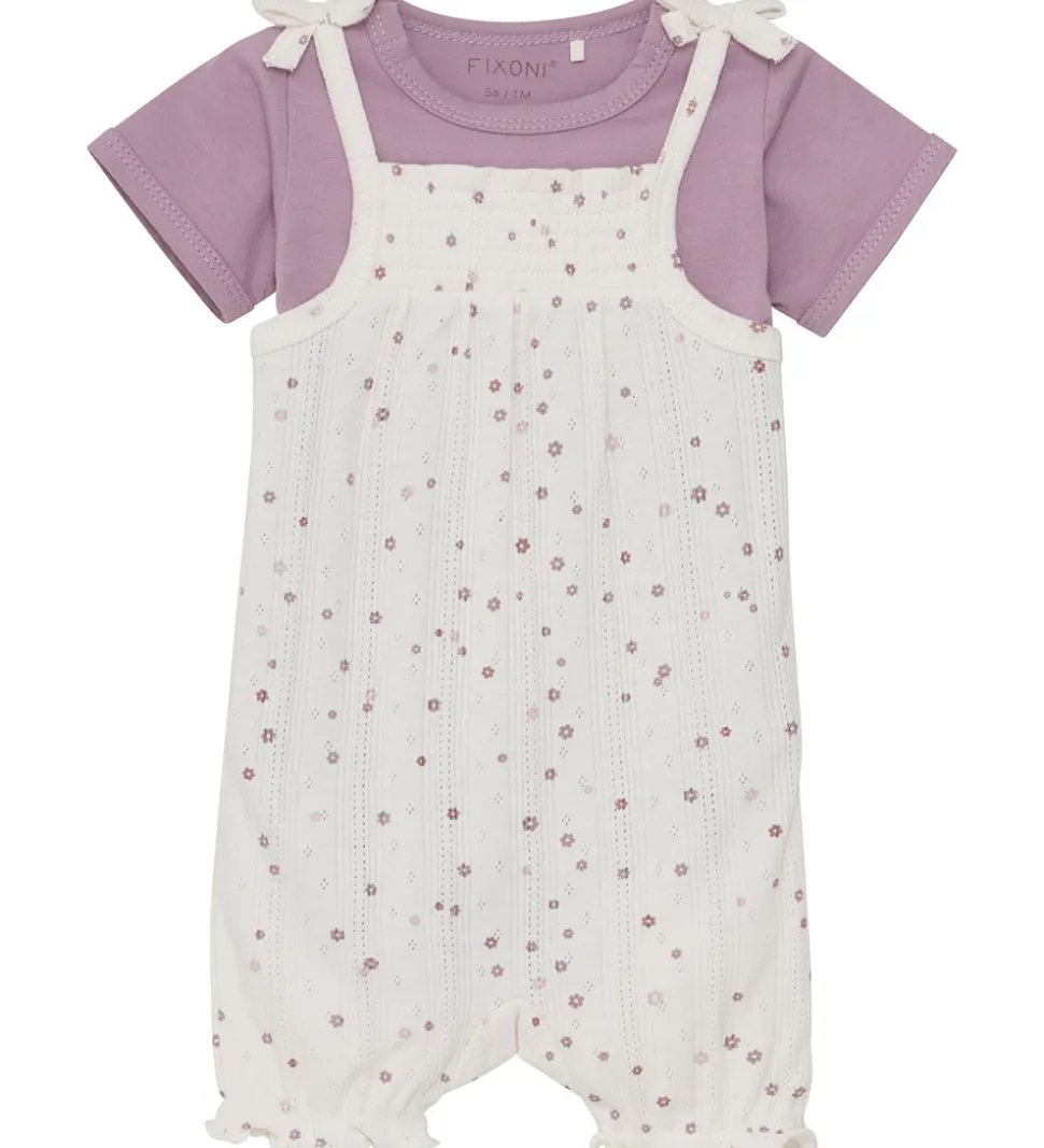 Sød Fixoni sommerdragt og body. Sommerdragten er hvid med et fint hulmønster og lilla blomsterprint. Bodyen er ensfarvet støvet lilla.
