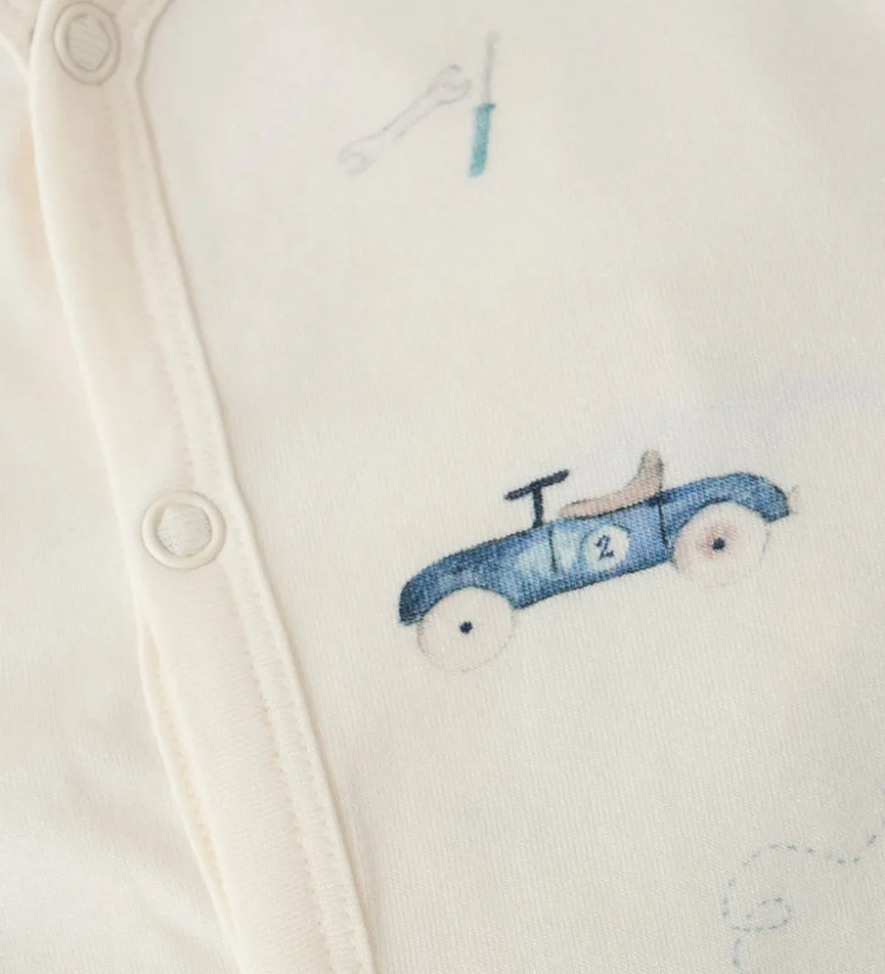 Yndig Fixoni heldragt i hvid med et legende bilprint i blå og brune nuancer.