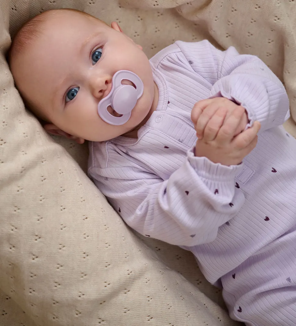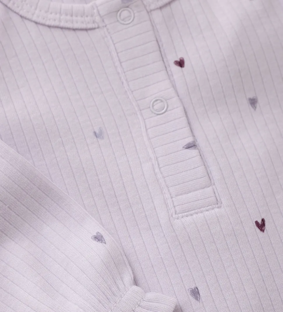 Charmerende Fixoni heldragt i sart lilla med et enkelt, småt hjertemønster og ribstruktur. Fixoni heldragten har lange ærmer og ben, og lukkes fortil med en stolpetrykknaplukning samt praktiske trykknapper mellem benene.