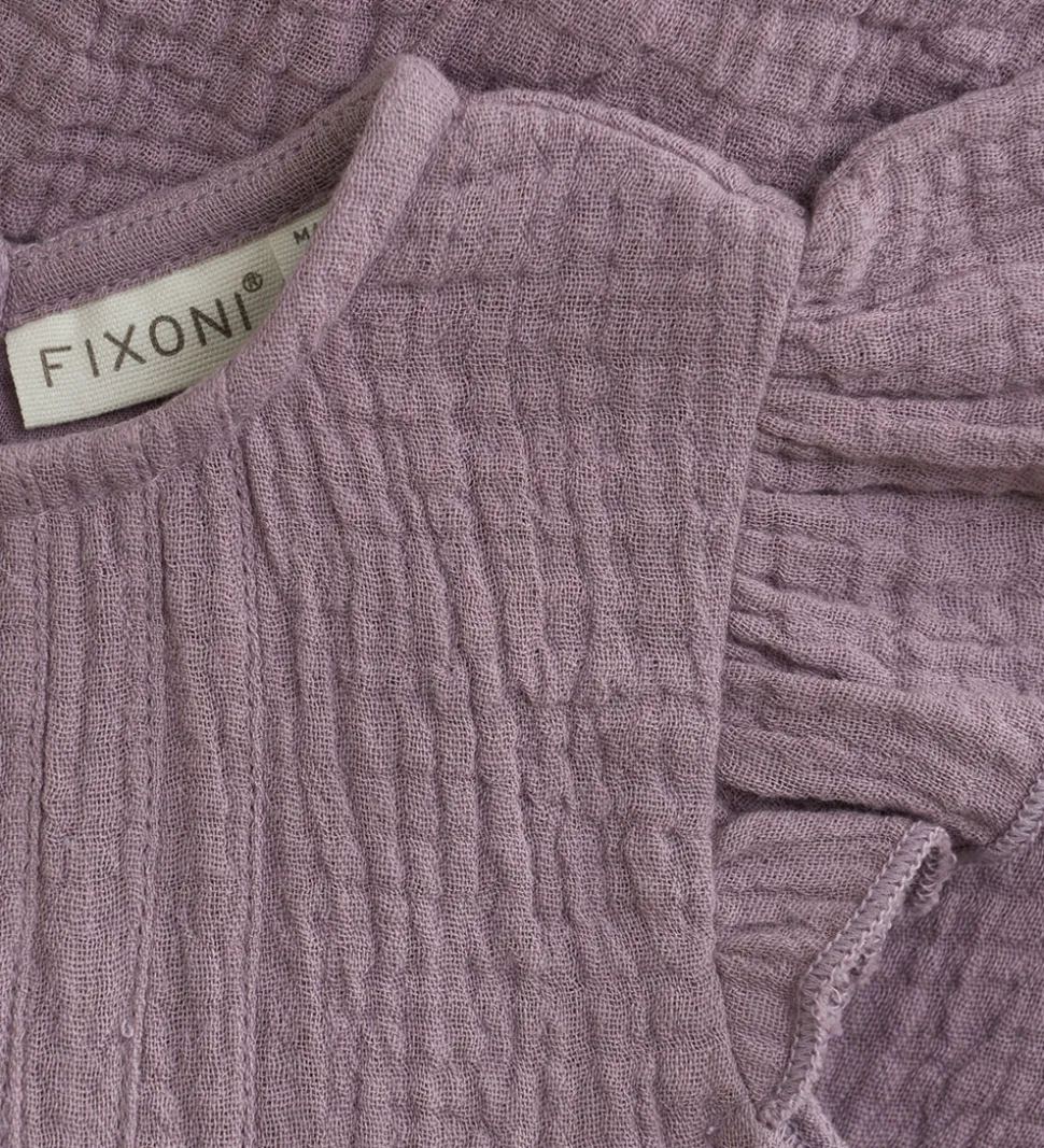 Charmerende Fixoni sommerdragt i en smuk støvet lilla nuance. Sommerdragten har korte flæseærmer og praktiske trykknapper i nakken, som sikrer nem påklædning.