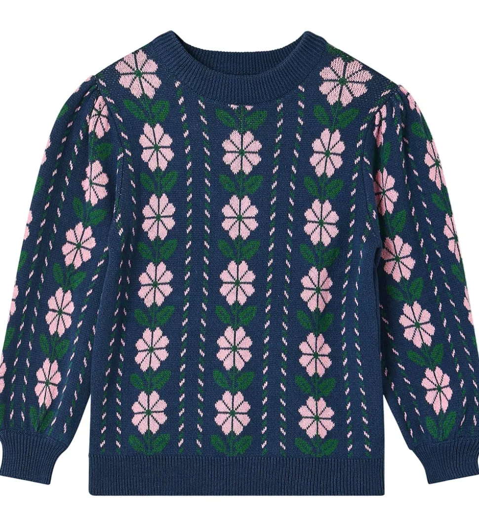 Charmerende Fliink bluse i mørkeblå med blomsterprint i rosa og grøn. Blusen har strikket struktur med ribkanter. Den har en rund halsudskæring og lange ærmer med rynker ved skuldrene.