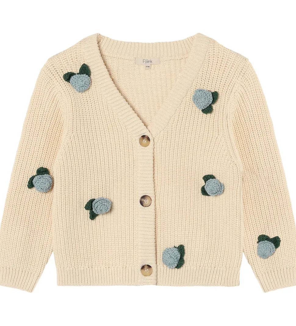 Fliink cardiganen har 3D-blomstermotiver i lyseblå og grønne farver, der tilføjer et særligt twist. Cardiganen er udstyret med knaplukning i fronten, hvilket giver en praktisk og stilfuld detalje. Den har lange ærmer og en v-hals, som giver et klassisk look.