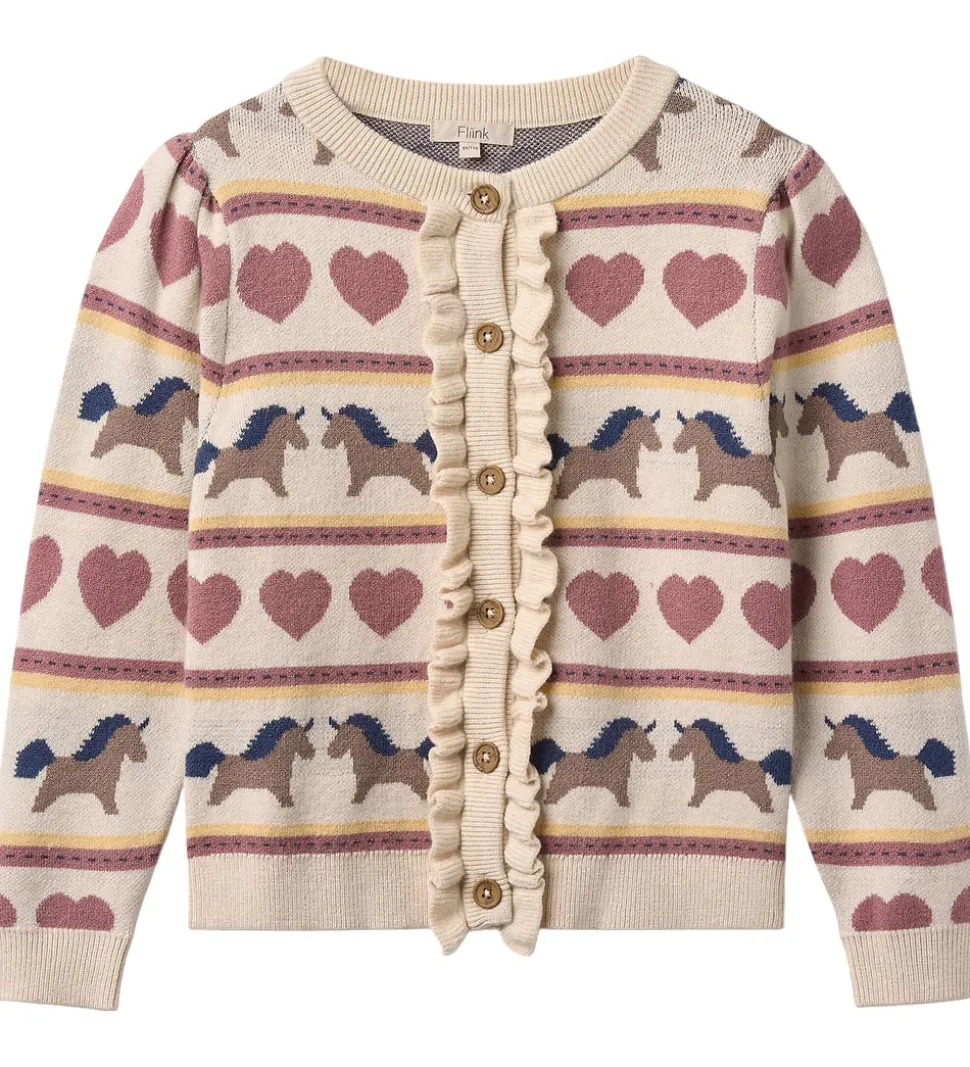 Charmerende Fliink cardigan i lys beige med print af heste og hjerter i rosa, brune og blå nuancer. Cardiganen har en strikket struktur med en rund halsudskæring og lange ærmer med rynker ved skuldrene. Fortil er der en gennemgående knaplukning med flæsekanter.