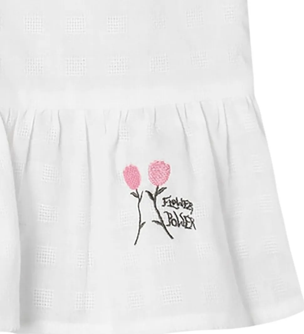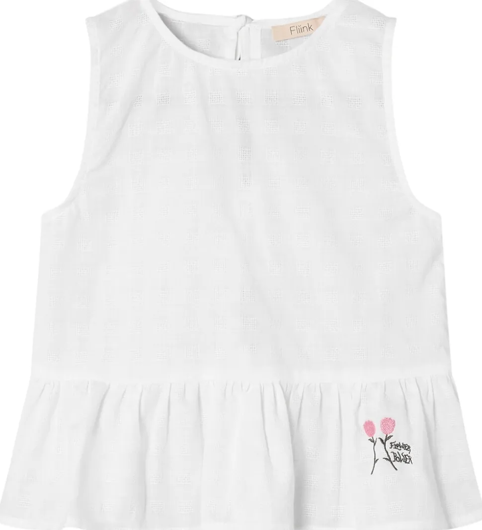 Elegant Fliink top i hvid med en lille, fin broderet blomst i lyserød.