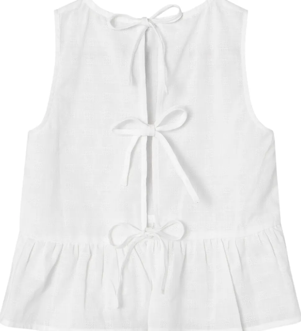 Toppen har et delikat hulmønster og en rund halsudskæring. Nederst har toppen en flot volant detalje, som tilføjer et ekstra pift til designet. Toppen fra Fliink lukkes med bindebånd på ryggen, som tilføjer en fin detalje.