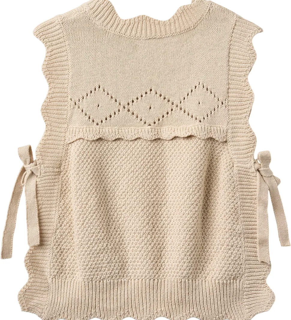 Charmerende Fliink vest i en lys beige nuance med flot strikket struktur. Vesten har et flot hulmønster øverst og i siderne er der bindebånd, som samler vesten under ærmerne. Vesten har en rund halsudskæring og bølgede kanter langs åbningerne.