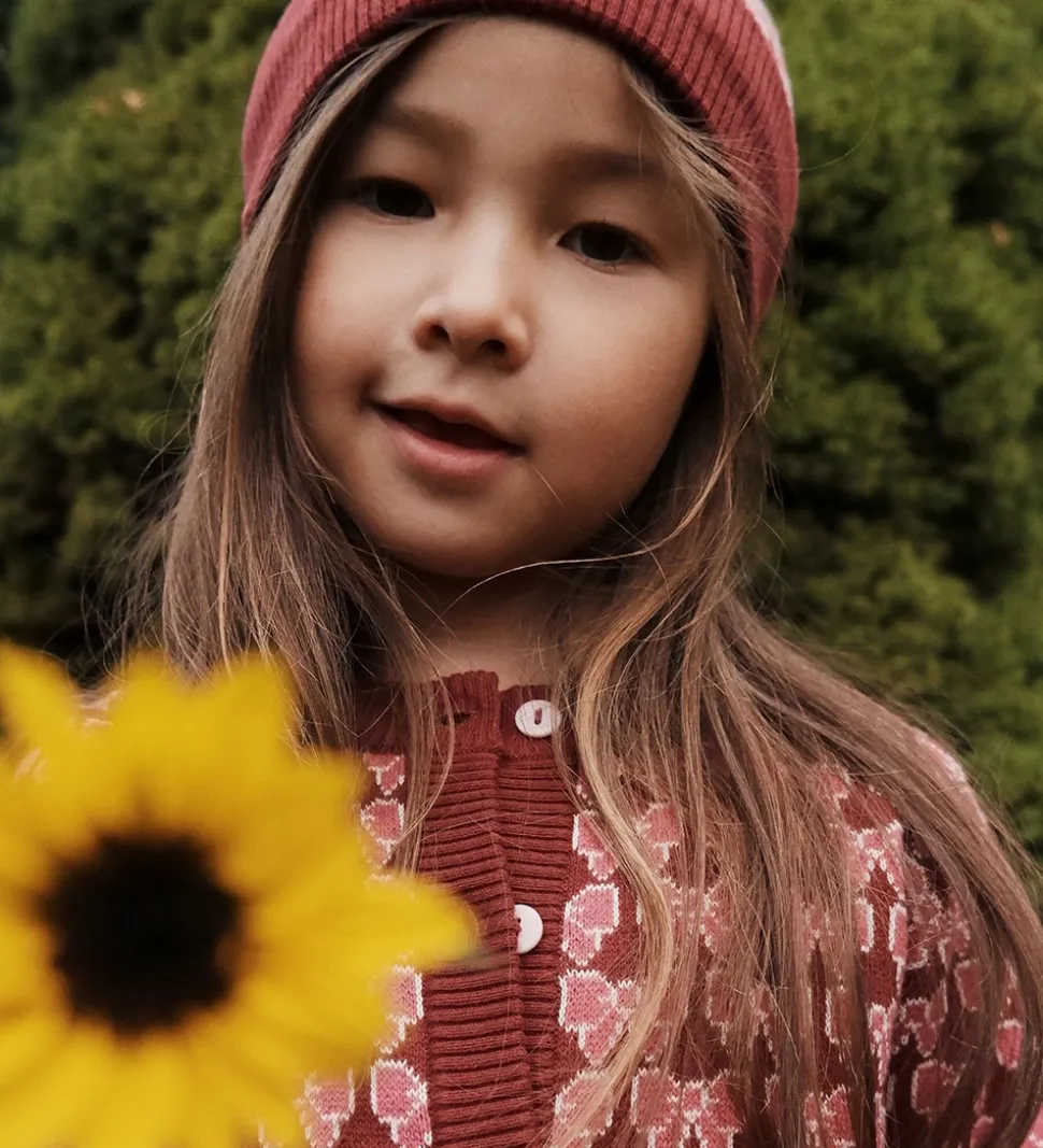 Flot Flöss cardigan i en dyb bordeauxrød med et flot mønster af lyserøde sløjfer.