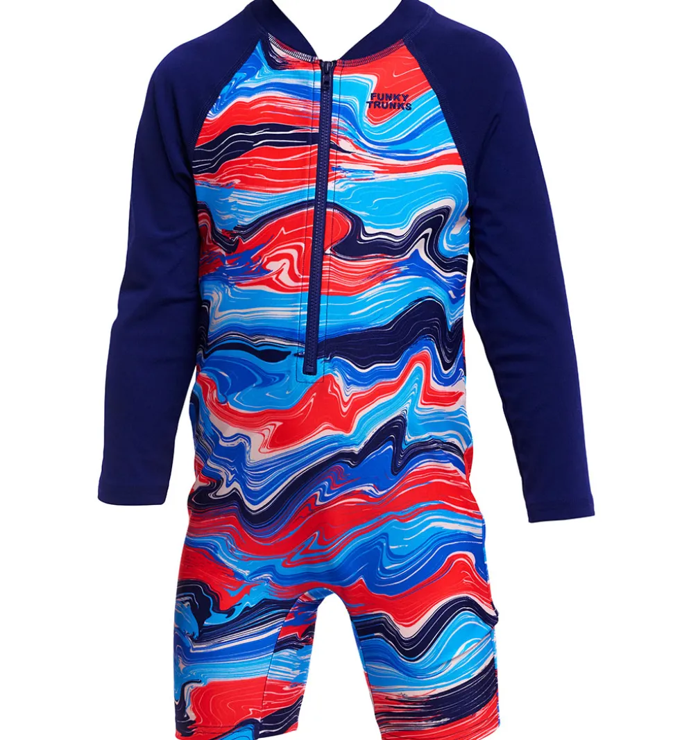 Funkita badeheldragten er lavet af et elastisk materiale og har lange ærmer og korte ben. Den kan åbnes fortil med en kort lynlås med invendig stolpe.