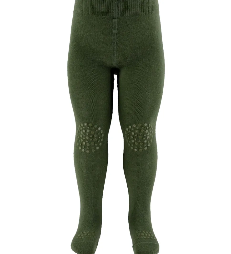 Smarte GoBabyGo kravlestrømpebukser i mørkegrøn, og de har gummidutter på og under foden samt på knæene.