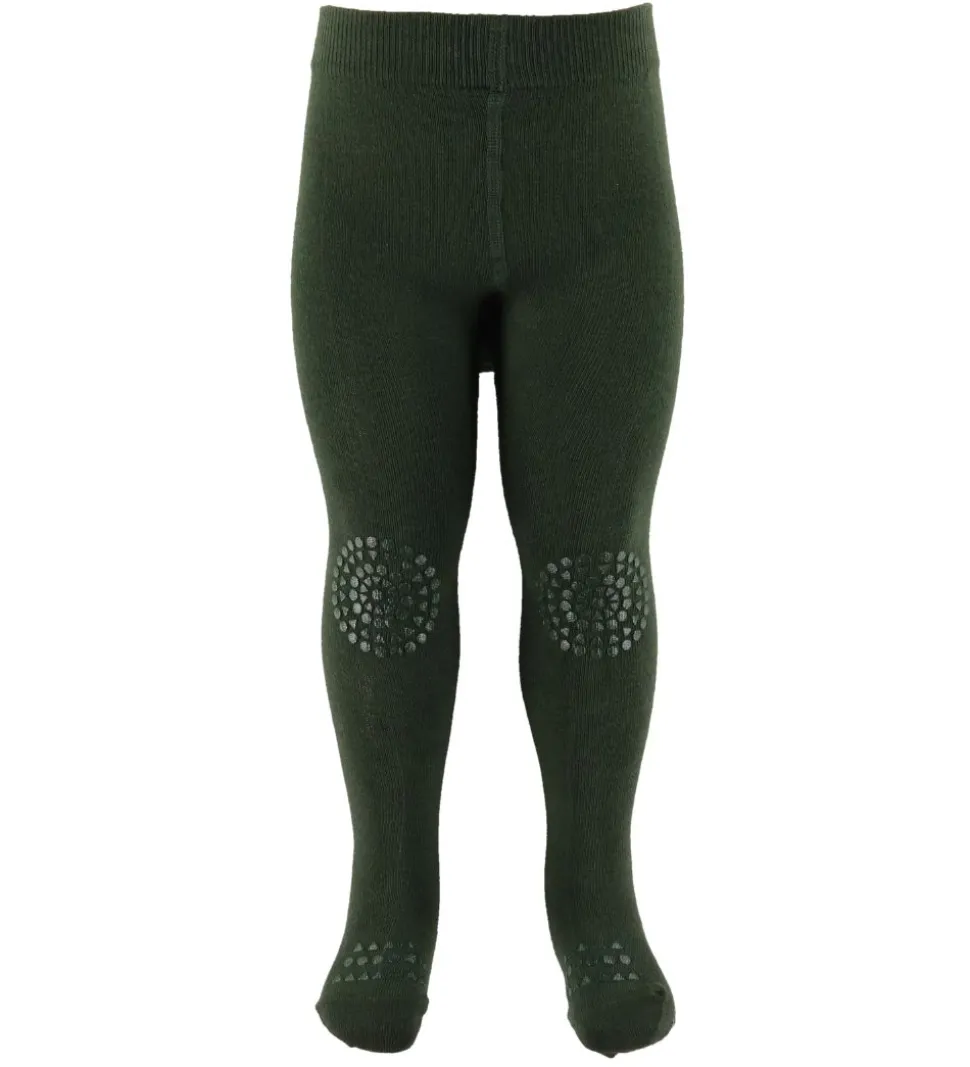 Dejlige GoBabyGo strømpebukser i mørkegrøn, med praktiske gummidutter på og under foden samt på knæene.