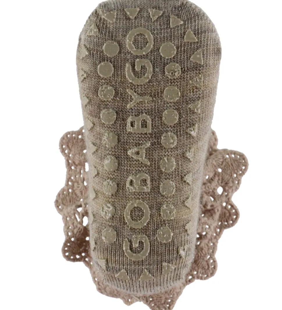 Lækre GoBabyGo skridsikre strømper i meleret beige med en flot blondeflæse rundt om skaftet.