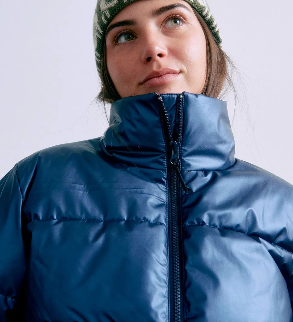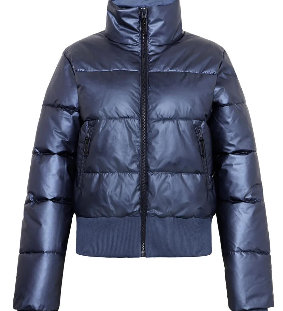 Flot Grunt dynejakke i en skinnende, mørkeblå nuance. Dynejakken har vandrette syninger, der giver et klassisk moderne udtryk.