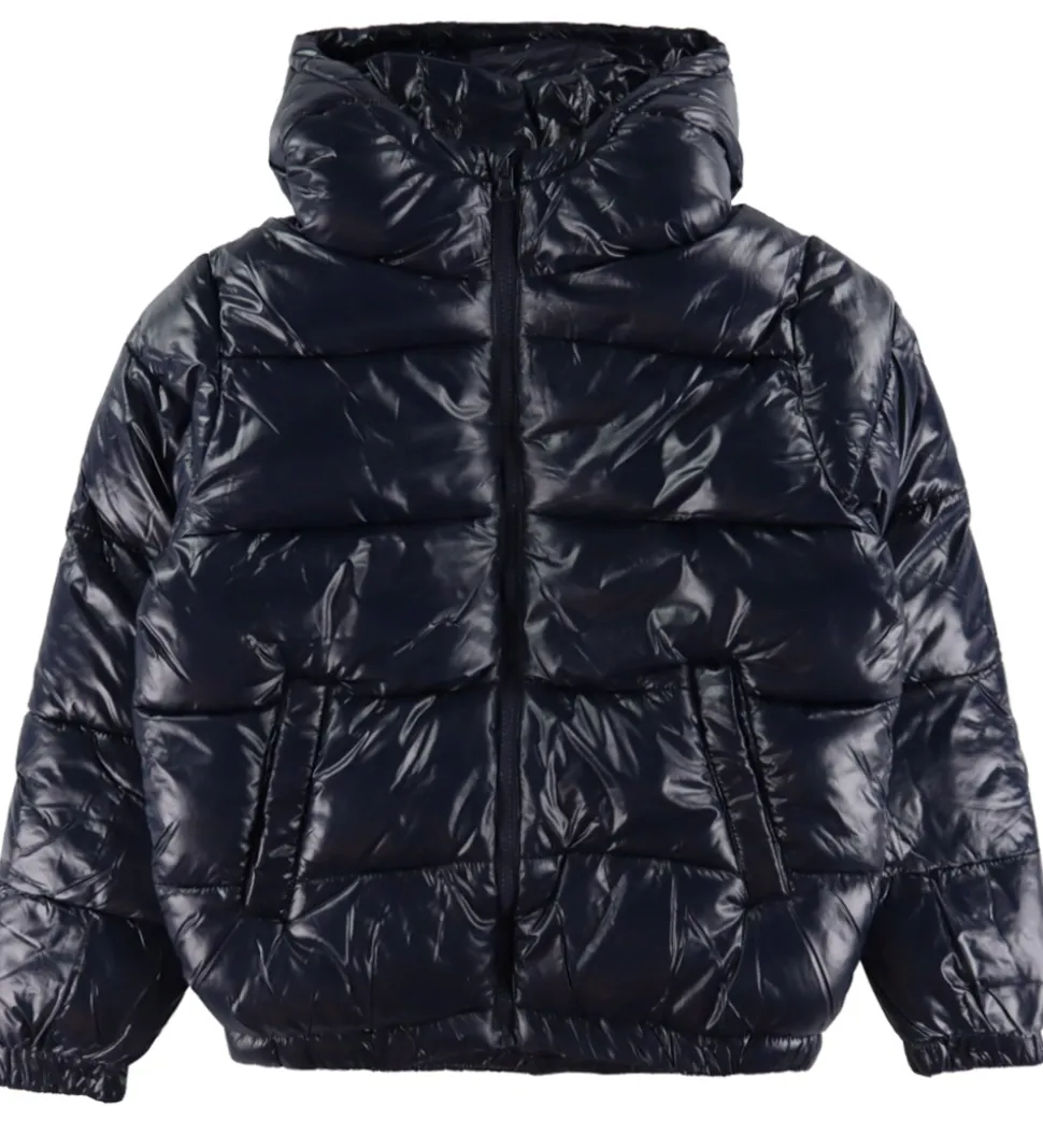 Elegant Grunt dynejakke i en blank, navy farve. De vandrette syninger tilføjer ekstra visuel dybde, som fremhæver stoffets struktur.