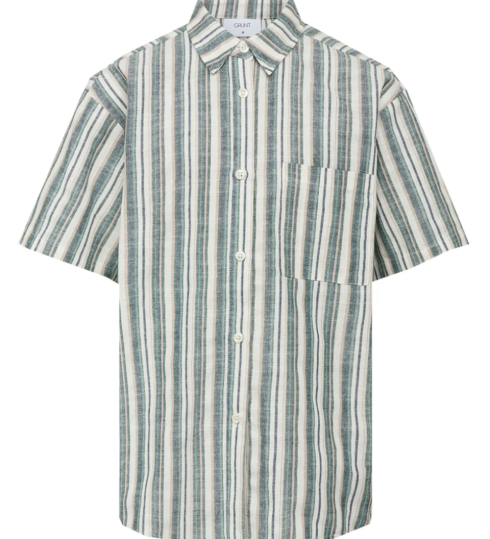 Grunt skjorten har korte ærmer og en klassisk krave. Skjorten åbnes fortil med gennemgående knapper og i taljen er der korte slidser i siderne. Skjorten er i en lækker blandingskvalitet.