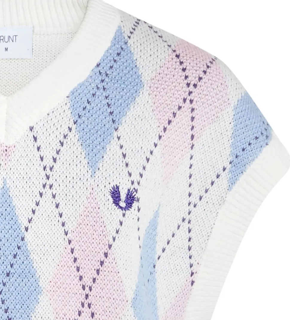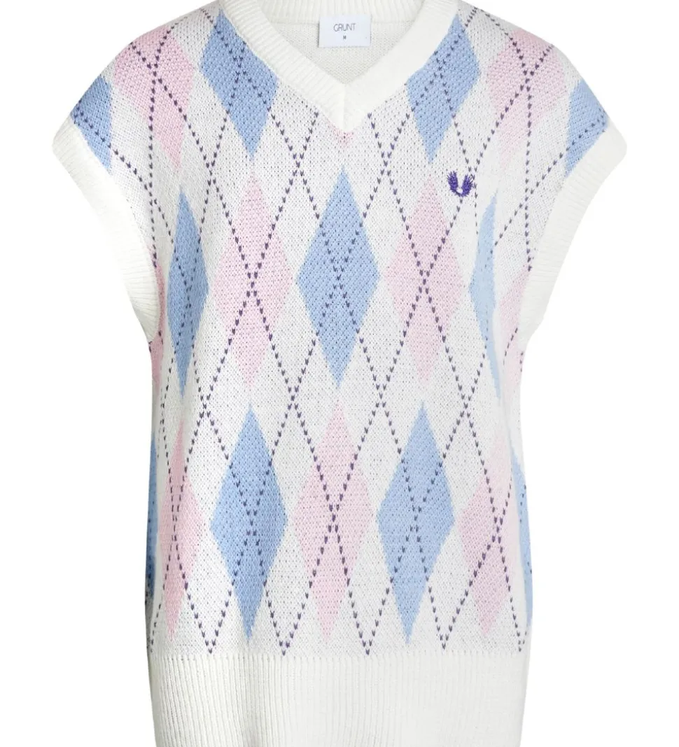 Smart Grunt vest i hvid strik, og fortil er der et harlequinmønster i lyseblå og rosa.