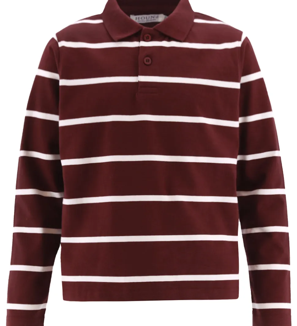 Elegant Hound polo med lange ærmer og et klassisk, tidløst design. Poloen er i en mørk rød nuance og har brede, horisontale hvide striber, hvilket giver et stilrent udtryk. Hound poloen er forsynet med knapper ved halsåbningen for nem justering.