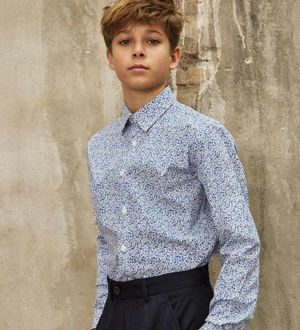 Fin Hound skjorte i hvid, med blomster i sort og blå over det hele.