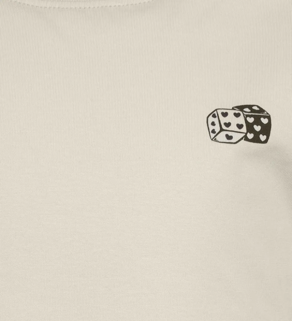 Flot Hound t-shirt i lys biege med print af to terninger på venstre bryst og et stort print med samme motiv samt tekstprint på ryggen. Hound t-shirten har en rund halsudskæring med en smal ribkant og korte ærmer.