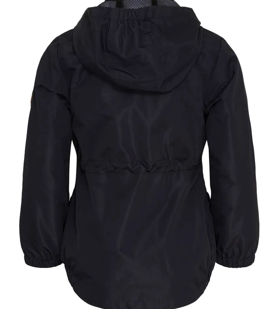 Hulabula sommerjakken har en aftagelig hætte, som sidder fast med trykknapper uden på den høje halskrave. Hætten har elastikkant i toppen. Og omkring håndledene er der elastikkanter.