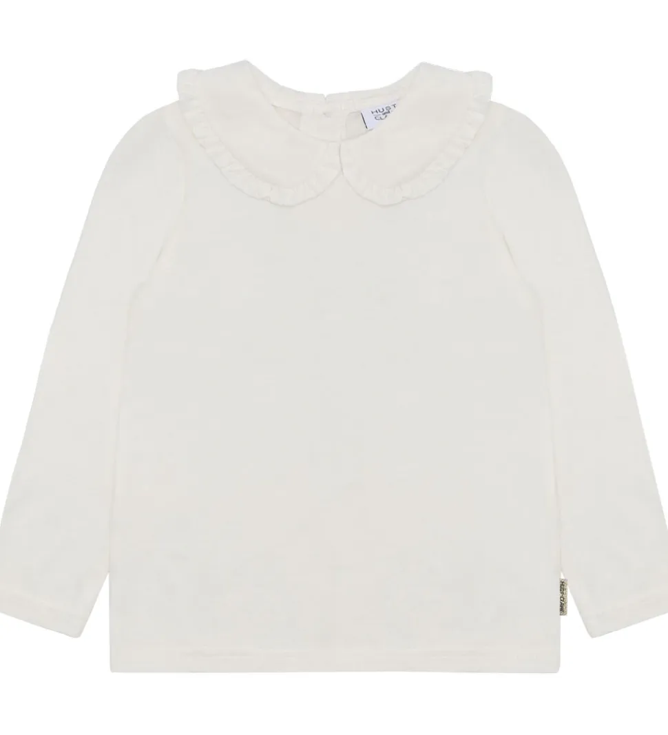 Elegant bluse fra Hust and Claire i en enkel hvid farve. Blusen har lange ærmer og en rund halsudskæring med fine flæsedetaljer langs kanten af kraven. Hust and Claire blusen lukkes i nakken med knapper.