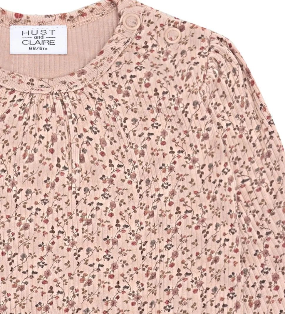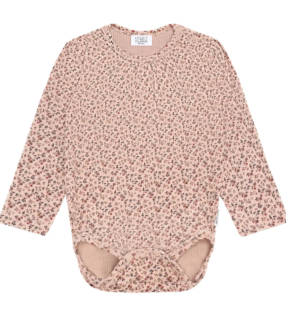 Charmerende Hust and Claire body i en blød rosa nuance med et delikat blomstermønster. Bodyen har lange ærmer og en rund halsudskæring, der giver et klassisk udtryk. Hust and Claire har designet denne body med fine rynkedetaljer ved halsen, som tilføjer et elegant touch.