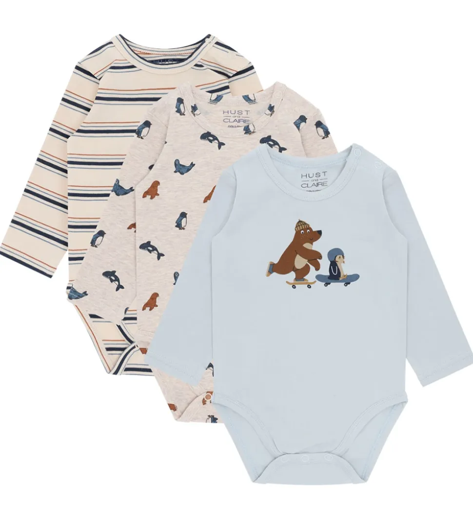Charmerende Hust and Claire bodyer i en 3-pak med varierende designs. Den ene body har et stribet mønster i afdæmpede blå og beige toner. En anden body er dekoreret med små dyreprint på en lys beige baggrund. Den tredje body er ensfarvet lyseblå med en sød illustration af en bjørn og pingvin på skateboard.