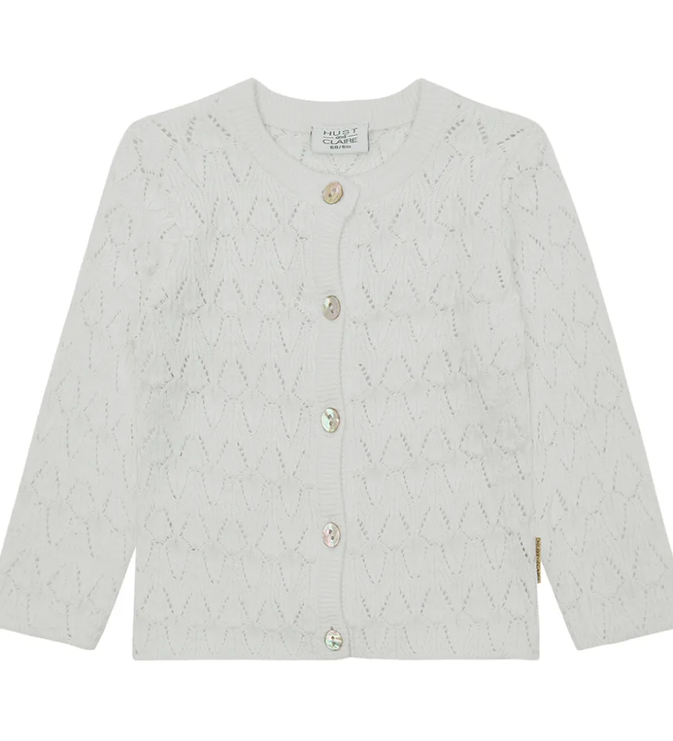Lækker Hust and Claire cardigan i hvid strik med et flot allover hulmønster samt gennemgående lukning med perlemorsknapper fortil.